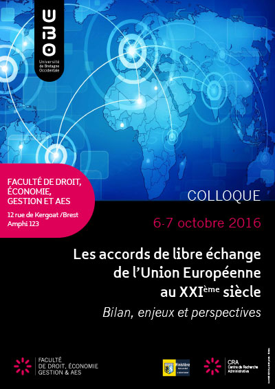 Un colloque portant sur le thème Du marché commun au grand marché transatlantique, l’Union européenne, le droit et le libre échange. Bilan, enjeux et perspectives aura lieu à Brest les 6 et 7 octobre prochains. Ce colloque est organisé par le Centre de Recherche Administrative de la Faculté de Droit, Economie, Gestion et AES de l’Université de Bretagne Occidentale.