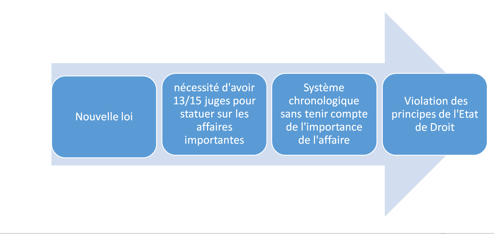 La loi prévoyait notamment de réunir 13 juges sur 15 pour statuer des affaires importantes et surtout de traiter les affaires dans l’ordre chronologique sans tenir compte de leur importance. Une situation qui paralysait de fait le Tribunal. Autre défaut d’importance : l’introduction des mécanismes menant à la violation des principes d’un État de droit.