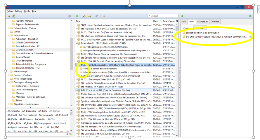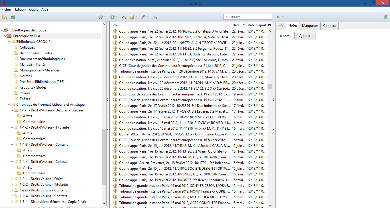 Pour le moment, la difficulté essentielle de Zotero réside dans l’absence d’un style de citation adéquat pour les juristes. Les styles actuellement disponibles ne correspondent pas aux canons juridiques. Qui plus est, les éditeurs n’ont pas harmonisé leurs manières de citer. Quant aux données extraites du SUDOC ou de Légifrance, il est souvent nécessaire de les reprendre manuellement. Seul un style optimisé pour la recherche juridique Zotero permettrait un réel gain de temps. En attendant la création de ce style, Zotero peut être utilisé pour classer et pour partager des données brutes.