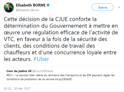 Tout d’abord parce qu’il tranche la question posée par la juridiction de renvoi, à savoir si Uber est seulement un service d’intermédiation électronique, pouvant clamer les bénéfices de la directive sur le commerce électronique (2000/31/CE) et ceux de la directive services (2006/123/CE), ou si, au contraire c’est un service de transport lequel, n’étant pas réglementé au niveau européen, reste soumis aux règles nationales. Par la même, il préjuge du résultat dans Uber France, à savoir que, en tant que service de transport, Uber doit se conformer aux réglementations nationales applicables en la matière.