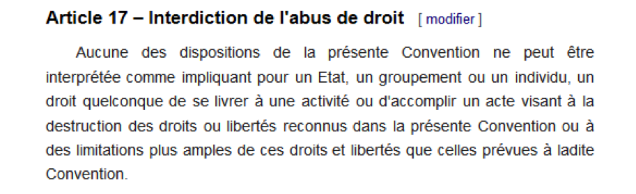 Si cette disposition a vocation à s’appliquer en tant que moyen procédural permettant à la Cour de déclarer irrecevables les requêtes des auteurs qui « cherchent à se prévaloir des droits et libertés garantis par la Convention afin de les détruire ou de les vider de leur substance », ceci n’est pas le seul but de la disposition. Comme exposé dans l’opinion, les travaux préparatoires à l’article 17 confirment que des menaces peuvent émaner des États mêmes. Le représentant italien avait ainsi insisté sur l’insertion d’un article d’un libellé similaire à l’article 30 de la Déclaration universelle des droits de l’homme, ou encore, comme le soulignent les juges dans l’opinion, à l’article 5 commun au Pacte international relatif aux droits civils et politiques et au Pacte international relatif aux droits économiques, sociaux et culturels. Les juges concluent ainsi que « l’article 17 va bien au-delà de cas isolés de limitations inacceptables de droits individuels et permet de (voire est destiné à) prendre en compte les problèmes structurels où les abus de droits se prolongent et ressortent de la gravité générale de telle ou telle restriction au droit fondamental en question ».