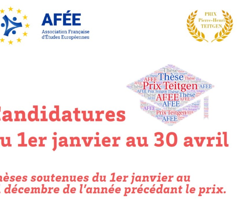 Chaque année, l’AFÉE récompense une thèse de doctorat en langue française qui contribue à l’amélioration des connaissances relatives à l’intégration européenne. Les candidatures doivent être adressées être adressées à secretariatcedece@gmail.com Voir le règlement du prix Voir les lauréats des années précédentes Continuer de lire Ouverture campagne prix Teitgen, deadline 30 avril