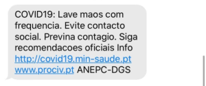 Under the pre-existing legal framework, the system of warnings to the population was activated by the declaration of a state of alert by the Ministers of the Interior and of Health on 13 March. The system is intended to provide information, warnings, and advice to the public in general or located in a specific region or municipality and not to send individualized SMS. This allowed the Civil Protection Authority (ANEPC), in collaboration with the Directorate-General of Health (DGS), to ask telecommunications operators to send text messages (SMS) related to the Covid-19 pandemic to the population. The first of these messages was send on 17 March and read: «COVID19: Wash hands regularly. Avoid social contact. Prevent virus spreading. Follow recommendations. Info http://covid19.min-saude.pt www.prociv.pt /ANEPC-DGS».