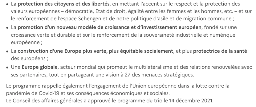 L’objet de ce post n’est pas de synthétiser les soixante-seize pages du programme de la PFUE2022, ni même de détailler les plus importantes, mais d’ouvrir le débat et de susciter de nouvelles publications. De façon symbolique, la PFUE2022 communique autour de trois textes emblématiques qui seront au cœur de ses travaux: