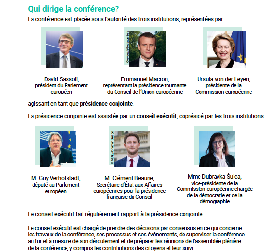 La PFUE2022 assure la co-présidence de la Conférence sur l’avenir de l’Europe ainsi que de son Conseil exécutif. A ce titre, la PFUE a pour ambition « d’identifier les priorités d’action de l’UE pour l’avenir » et d’aboutir » à des mesures les plus concrètes possibles afin d’identifier les moyens de les mettre en œuvre ». (Programme PFUE2022 p. 8 sur le renforcement de la démocratie européenne). Cette priorité a aussi été affichée dans l’introduction du programme commun qui prévoit une coordination du trio des présidences sur ce point central.