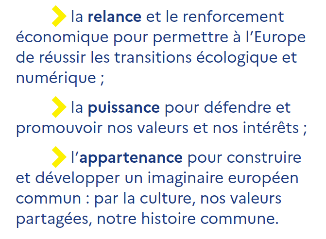 Enfin, le Président Macron a clairement choisi de placer la PFUE2022 au cœur de sa stratégie pour sa future campagne présidentielle au point que certains y voit une « présidence de trop » ou une « présidence à risque« . Le programme de la PFUE2022 apparaît alors comme une version actualisée des orientations fixées par le Président de la République dans son discours pour une Europe souveraine, unie et démocratique prononcé le 26 septembre 2017 à La Sorbonne. Il est présenté autour d’une devise en trois mots clefs: Relance, puissance, et appartenance.