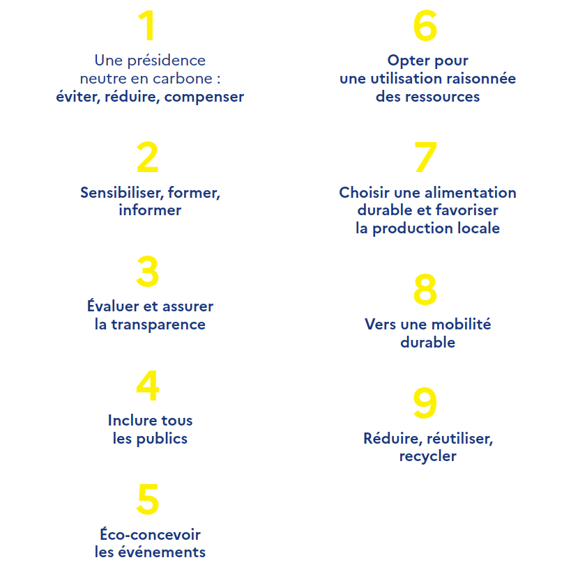 Pour finir de façon plus anecdotique la PFUE2022 met l’accent sur deux thématiques. La PFUE2022 entend assurer la sauvegarde du multilinguisme dans l’UE, fort du rapport de Christian Lequesne qui fera l’objet d’un futur post. La PFUE2022 se pose aussi en modèle en établissant une cadre de référence développement durable pour être neutre en carbone sur la base de neufs engagements.