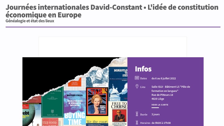 Les 6, 7 et 8 juillet 2022 auront lieu les 7e Journées internationales David-Constant consacrées au thème “L’idée de constitution économique en Europe : Généalogie et état des lieux”, organisées par la Faculté de Droit, de Science Politique et de Criminologie de l’Université de Liège, sous l’égide de l’Association internationale de droit économique. Le colloque vise à retracer l’histoire, mouvementée, du concept et à en étudier l’actualité au sein … Continuer de lire L’idée de Constitution économique en Europe (Liège, 6-8 juillet)
