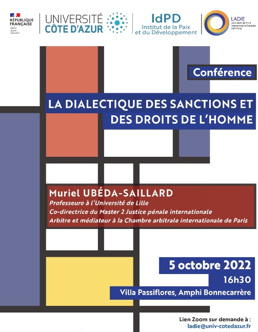 Dans le cadre de la chaire Jean Monnet « Union européenne et gestion des crises » et de la chaire UNESCO « Paix et développement par le droit » (P2D) Conférence : « LA DIALECTIQUE DES SANCTIONS ET DES DROITS DE L’HOMME » par Muriel UBÉDA-SAILLARD,Professeure à l’université de LilleCo-directrice du Master 2 Justice pénale internationaleArbitre et médiateur à la Chambre arbitrale internationale de Paris Mercredi 5 octobre, 16h30 Campus Trotabas – … Continuer de lire Conférence « La dialectique des sanctions et des droits de l’homme », Nice