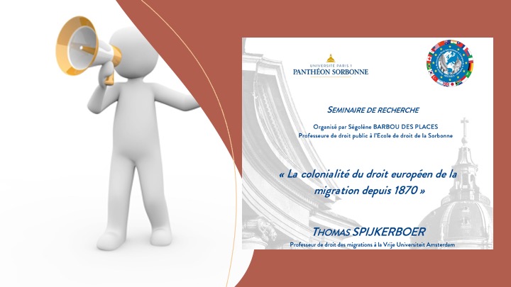Ségolène BARBOU DES PLACES, Professeure de droit public à l’École de droit de la Sorbonne, organise un séminaire de recherche sur la colonialité du droit européen de la migration depuis 1870, avec THOMAS SPIJKERBOERProfesseur de droit des migrations à la Vrije Universiteit Amsterdam, Lundi 3 octobre 2022 (15h30 – 17h30), Centre Lourcine – Campus Port RoyalSalle Luchaire – Bâtiment 11 Rue Glacière 75013 Paris Inscription … Continuer de lire La colonialité du droit européen de la migration depuis 1870, Paris, 3 octobre