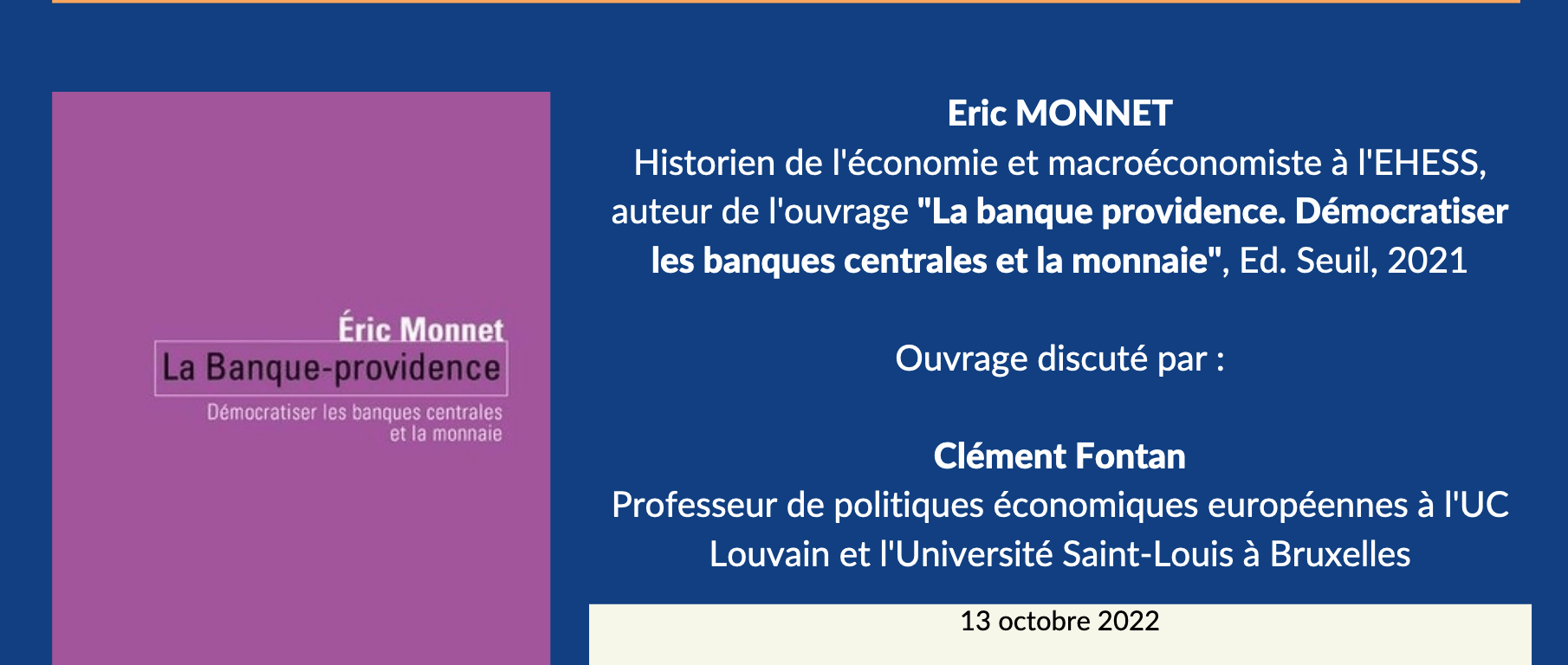 Eric MONNET, directeur d’études à l’EHESS et à l’École d’Économie de Paris, présentera son ouvrage La banque providence. Démocratiser les banques centrales et la monnaie, Seuil, 2021.