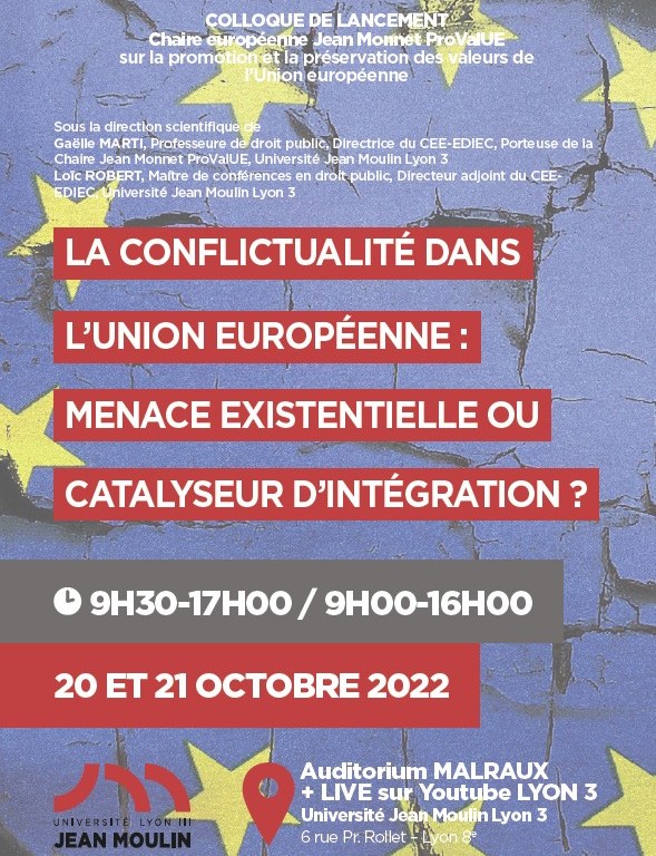 Les 20 et 21 octobre 2022, le Centre d’Etudes Européennes de l’université Lyon 3 organise, sous la direction scientifiques de Gaëlle Marti, Professeure de droit public et Loic Robert, Maître de conférences en droit public, un colloque intitulé « la conflictualité dans l’Union européenne : menace existentielle ou catalyseur d’intégration? ».