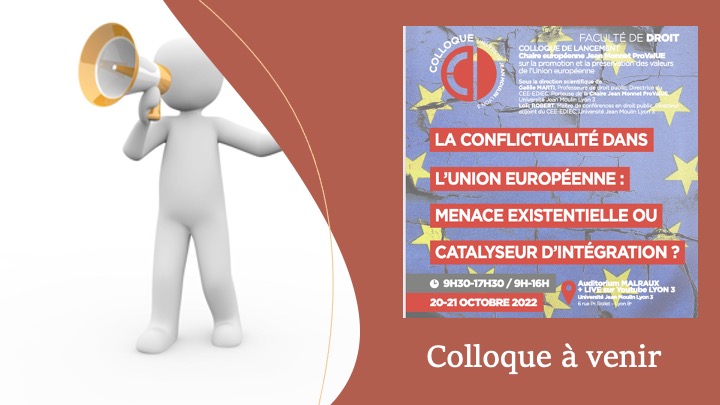 Les 20 et 21 octobre 2022, le Centre d’Etudes Européennes de l’université Lyon 3 organise, sous la direction scientifiques de Gaëlle Marti, Professeure de droit public et Loic Robert, Maître de conférences en droit public, un colloque intitulé « la conflictualité dans l’Union européenne : menace existentielle ou catalyseur d’intégration? ». Ce colloque sera également l’occasion de lancer officiellement la Chaire européenne Jean Monnet ProValUE « promotion et préservation … Continuer de lire La conflictualité dans l’Union européenne : menace existentielle ou catalyseur d’intégration?, 20-21 Octobre Lyon