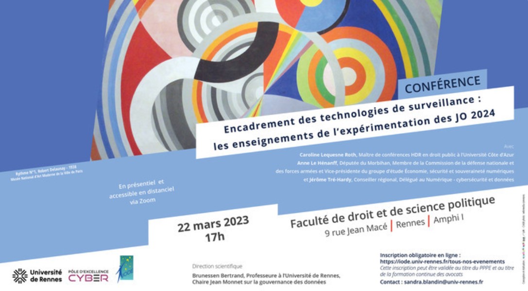 Le laboratoire IODE a le plaisir de vous informer de la tenue de la conférence le 22 mars 2023 « Encadrement des technologies de surveillance : les enseignements de l’expérimentation des JO 2024 » organisée par Brunessen Bertrand, Professeure à l’Université de Rennes, IODE UMR CNRS 6262, Chaire Jean Monnet sur la gouvernance des données.