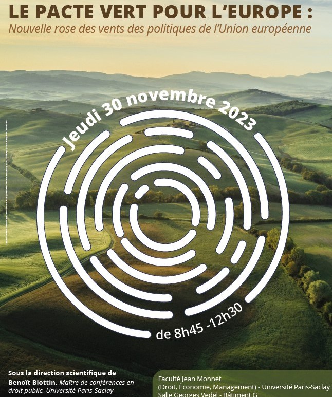Conférence portant sur « Le Pacte vert pour l’Europe, nouvelle rose des vents des politiques de l’UE », qui se tiendra le jeudi 30 novembre de 8h45 à 12h30 à la Faculté Jean Monnet – Université Paris-Saclay, Salle Georges Vedel, 54 boulevard Desgranges, 92330 Sceaux. Programme Continuer de lire Conférence à l’Université Paris-Saclay – Pacte vert pour l’Europe – 30 novembre