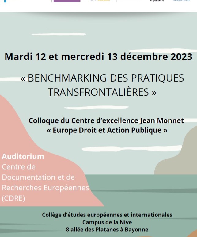 Dans le cadre du Centre d’excellence Jean Monnet « Europe Droit et Action publique », le Centre de Documentation et de Recherches Européennes (CDRE) organise un colloque dédié à un « Benchmarking des pratiques transfrontalières ». Ce colloque aura lieu mardi 12 et mercredi 13 décembre à l’Auditorium du CDRE, au sein du Collège d’études européennes et internationales de l’Université de Pau et des Pays de l’Adour (UPPA), situé sur le Campus de la Nive à Bayonne. Vous trouverez le programme complet des … Continuer de lire Colloque « Benchmarking des pratiques transfrontalières », 12 et 13 décembre
