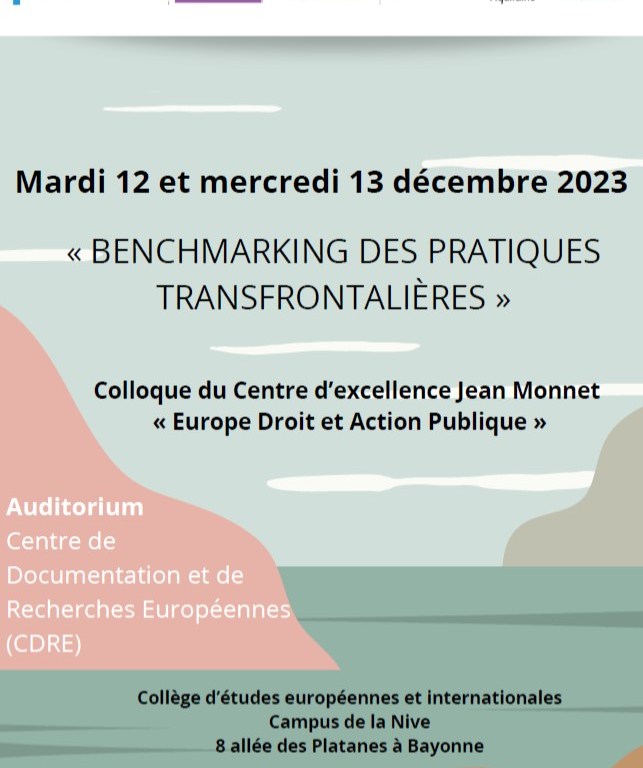 Dans le cadre du Centre d’excellence Jean Monnet « Europe Droit et Action publique », le Centre de Documentation et de Recherches Européennes (CDRE) organise un colloque dédié à un « Benchmarking des pratiques transfrontalières ». Ce colloque aura lieu mardi 12 et mercredi 13 décembre à l’Auditorium du CDRE, au sein du Collège d’études européennes et internationales de l’Université de Pau et des Pays de l’Adour (UPPA), situé sur le Campus de la Nive à Bayonne.