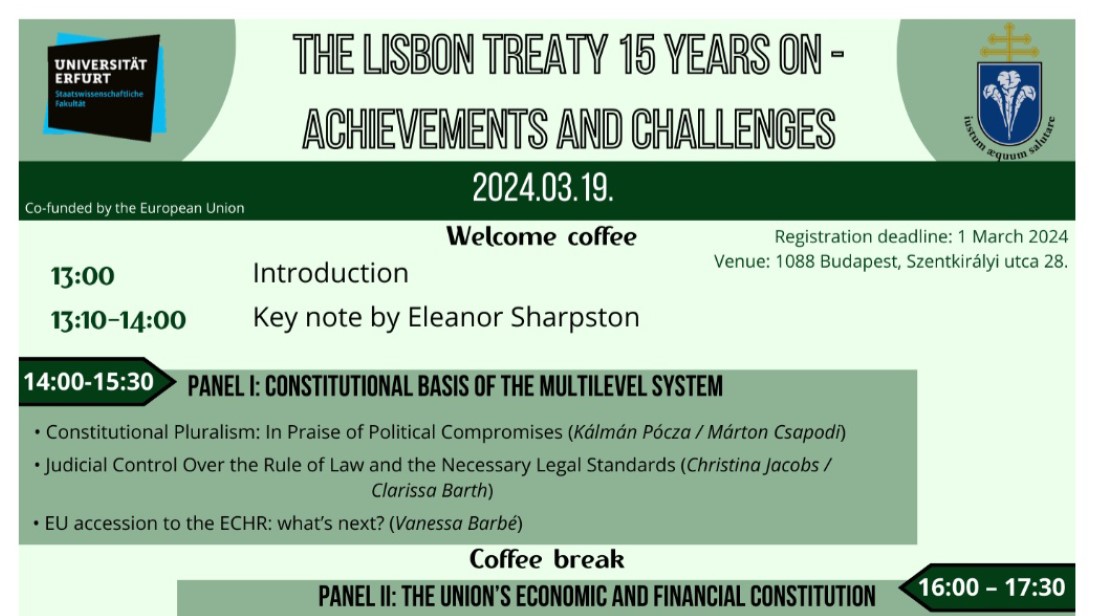 The Jean Monnet Project « Constitutional Prerequisites for the Future of the European Union » at the University of Erfurt (Dr. Robert Böttner) and the Department for EU Law at the Pázmány Peter Catholic University in Budapest (Prof. Dr. Petra Láncos) are organizing a conference on the state of play of the European Union 15 years after the Lisbon reform came into force, contemplating achievements and the need for possible future treaty amendments. The conference will take place on March 19-20, 2024 at Pázmány Péter Catholic University, Faculty of Law and Political Sciences.