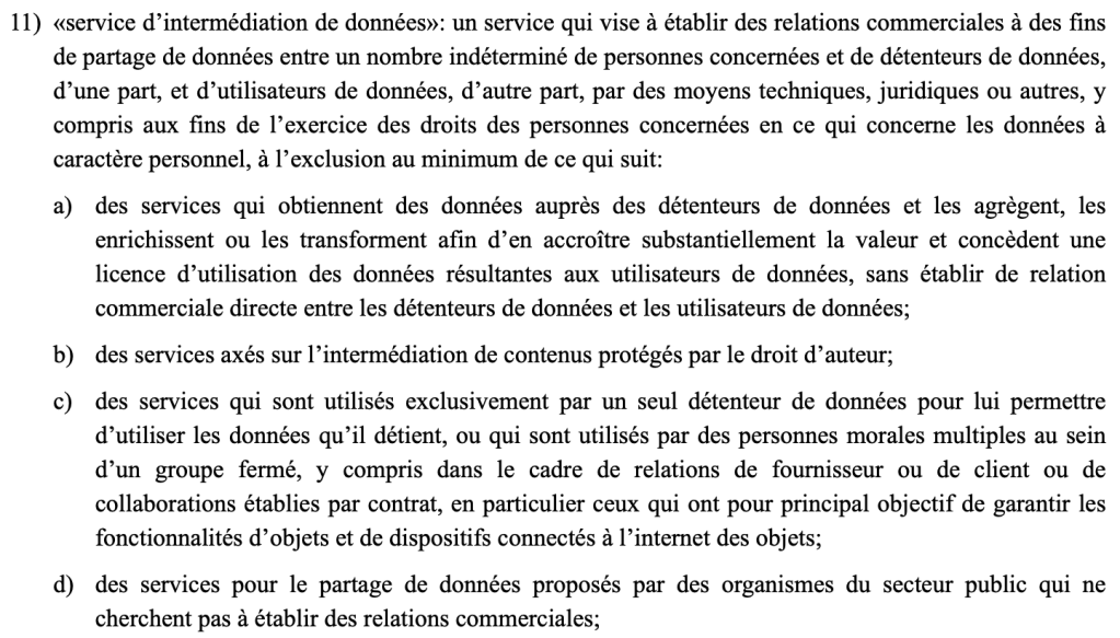 La proposition de règlement constate « la nature émergente du marché des services d’intermédiation de données » et en déduit que les obligations du Data Governance Act « doivent être assouplies pour permettre le développement de ce marché » (p. 20), au travers de trois aspects :